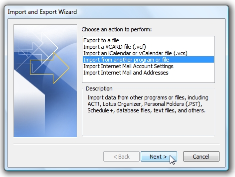 Select the 'Import from another program or file'' and click the 'Next>' button.