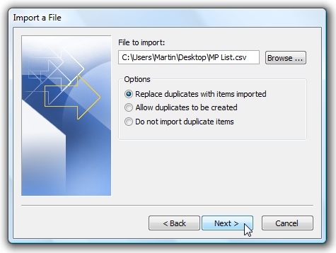Use the 'Browse' facility to locate the CSV file saved earlier and then click on the 'Next>' button.