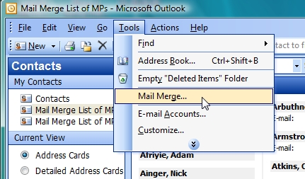 Select 'Mail Merge...' from Outlook's 'Tools' menu option.