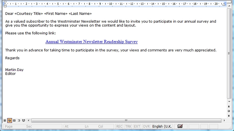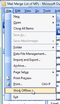 Please note that the emails will be automatically generated and sent immediately to the Outlook outbox and will use the default return address, if we did not want the emails to be delivered immediately (for example we might want to perform a final check first) we will need to take steps to delay the mailing. There are many ways this can be done, please consult your Outlook help documentation for full details, a simple method however would be to temporarily set the Outlook application to Work Offline prior to completing the mail merge process.