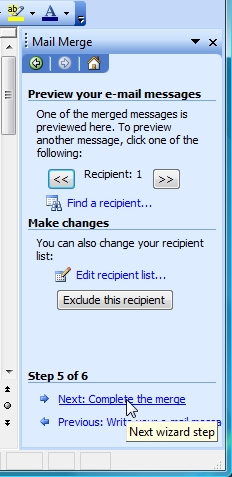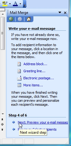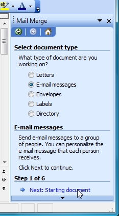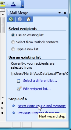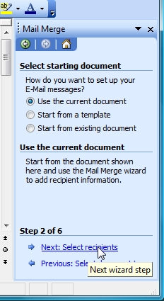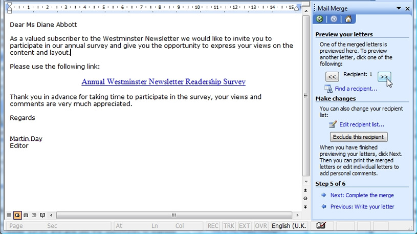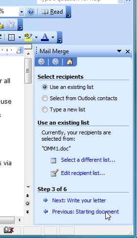 A 'Mail Merge' process box will be displayed to the right of the template document. Using the process we have used it will start at Step 3 of 6 and we recommend that you use the 'Previous' options to step back to Step 1.