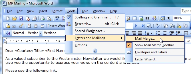 Once the document has been prepared click on the 'Tools' option and select the 'Letters and Mailings' and 'Mail Merge' option.